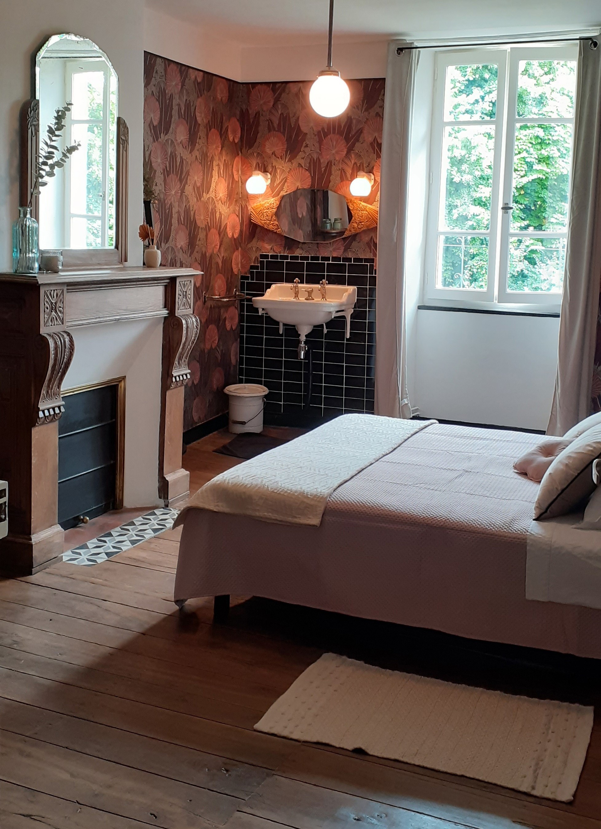 La Chambre Rose est dotée d'un parquet en chêne restauré, d'un lavabo rétro et d'une cheminée en chêne. Elle propose un lit double ou deux lits simples séparés, ainsi qu'un accès à une salle de bain privative avec douche, lavabo et toilettes.